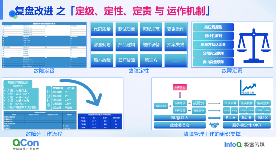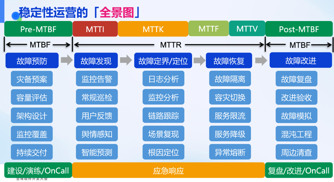 我们多年来在故障管理方面的经验提炼总结如下:首先,常规工作是一个大循环,包括故障的发生、处理、改进、稳定运行,再到周期性回顾,持续进行改进。此外,补充说明可用性体系,包括 SLI、SLO 和 SLA 等内容。