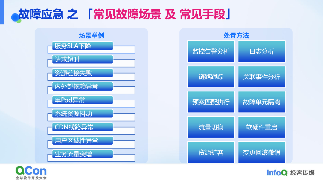 在故障处理中,常见的故障场景及应对手段可分为常规和非常规两类。常规故障包括服务 SLA 下降、超时、资源连接失败、内外部依赖异常等,尤其是业务重度依赖外部 API(如大语言模型、SaaS 服务)时,依赖异常可能导致服务问题。此外,单 Pod 异常、系统资源抖动等也是常见情况。应对这些常规故障的手段包括监控日志、告警、链路跟踪、预案匹配执行、故障隔离、流量切换,以及重启、扩容、回滚等较为直接的方法。