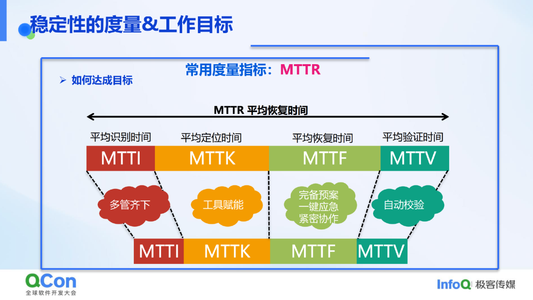 提升稳定性需要度量,常用指标是 MTTR(平均故障恢复时间)和 MTTF(平均无故障时长)。通过细化 MTTR 的各个阶段(如识别时间、定位时间、干预恢复时间、验证时间),并缩短这些时间,可以提升整体稳定性。具体方法包括: