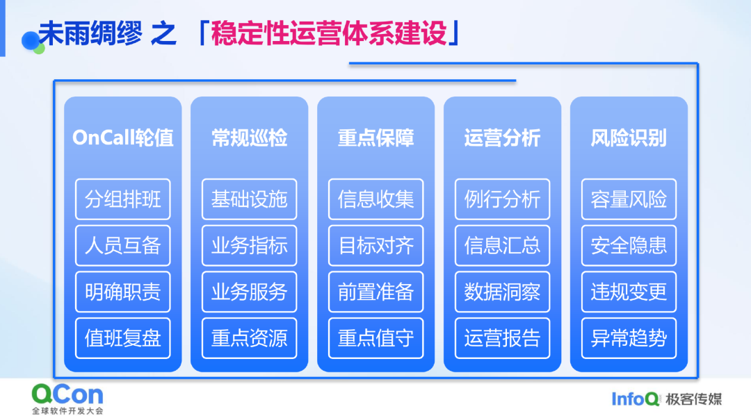 稳定性运营机制也很重要,从三四年前开始,运维向运营转变,核心在于主动和被动的区别。运维是被动解决问题,运营则是主动做好日常工作。例如,每天自动化巡检,OnCall 的 SRE 查看核心指标和业务 SLO,每周发布稳定性运营报告,同步稳定性事件、响应情况和建设计划,达成共识并持续运营。