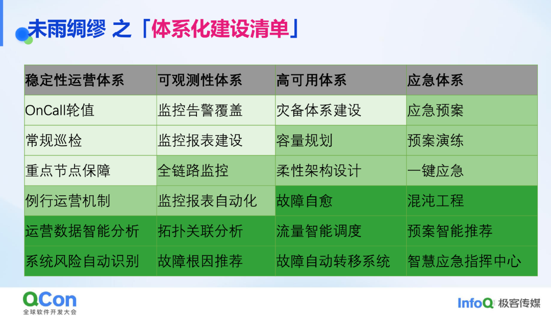 下图中的清单比较适用于中小型公司,不依赖大规模成熟开发团队,而是通过体系化流程制度和组织内部共识,将工作提升到及格水平。例如,常规的 OnCall 轮值、巡检和节假日重点保障是日常工作。今年还筹划成立公司内部的稳定性保障虚拟组织,把全年节假日和重点保障节点列出,匹配相应动作,根据节假日流量特点和保障级别勾选需要执行的事项,实现资源与稳定性目标的平衡。