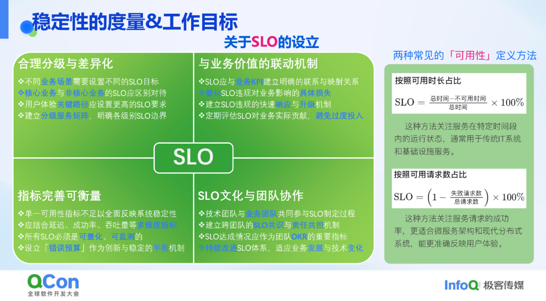 SLO(服务水平目标)设立要合理分级、差异化,与业务价值对齐,考虑业务场景、核心旅程、分级矩阵等。业务方(如业务老板)要参与 SLO 设立,明确营收指标与系统稳定性要求的关系,量化 SLO 不达标对业务的损失。同时,要建立快速响应和处理机制,避免过度投入,确保投入与收益平衡。SLO 指标要可衡量、可观测,可能需要多个指标组合来定义稳定性目标。此外,要引入平衡机制,如错误预算,鼓励业务创新。