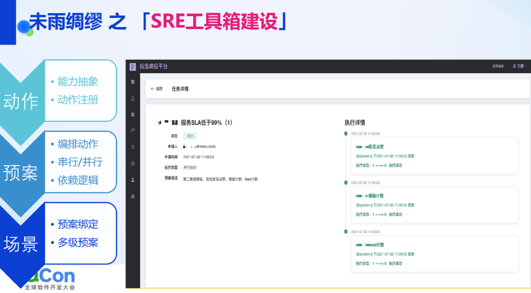 我们还有一个应急响应平台,英文名称叫 FAF,意为“Fight Against Failure”。该平台将对服务干预的手段抽象成一个个动作,并将这些动作注册到平台中。然后,通过编排这些动作,形成一个个预案。预案可以支持串行、并行、前后依赖等多种执行方式。最后,预设一些场景,根据场景匹配相应的预案。预案的执行方式可能有损、无损,可以通过卡片推送等方式手动或自动执行。未来,这个应急响应平台将整合到前面提到的 SRE 工具箱平台中。
