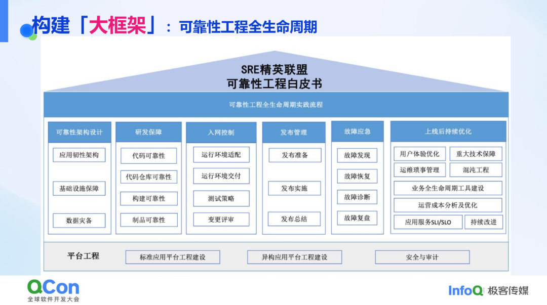 下图的《可靠性工程白皮书》汇集了行业优秀实践,总结出一个可靠性的框架,包括可靠性设计、研发保障、业务上线准入、发布管理、应急管理、上线后的持续优化等环节。按照这个框架开展稳定保障工作,可以按图索骥、避免跑偏,虽然这个框架不见得会覆盖所有的场景和环节,但据此实现基本的可靠性定是绰绰有余的。