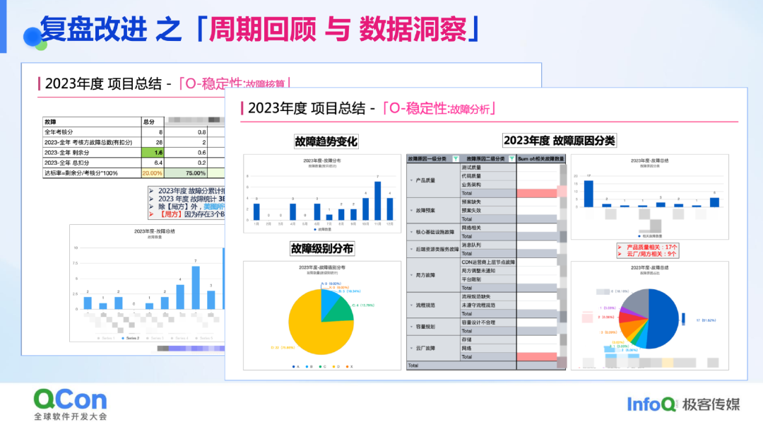 周期回顾时,会基于线上实际数据进行分析。例如,下图的 2023 年的年度 OKR 复盘中,会看总分、达成情况、达成率高低等。比如,可以发现 CDN 厂商和云厂的故障预算大幅超标,下半年故障高发,与节假日多、流量大以及某些“黑天鹅”事件有关;在故障原因分类的统计中,产品质量是主要因素,不过,一个故障可能涉及多种原因和类型,需全面关联,以便后续分析改进。
