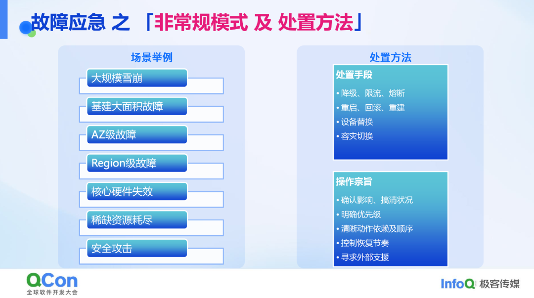 非常规故障场景则更为严重,例如大规模雪崩效应、基础设施(如云服务的 AZ 或 Region 级别)故障、硬件失效、稀缺资源耗尽等。以 AIGC 业务为例,GPU 资源消耗巨大,春节期间资源需求激增五六倍,这种情况下资源获取困难,需要内部和外部多方协调解决。此外,还有可能出现安全攻击,应对手段可能包括更强力的降级、限流、熔断、重启、回滚、重建等,甚至涉及硬件设备的替换和容灾切换。