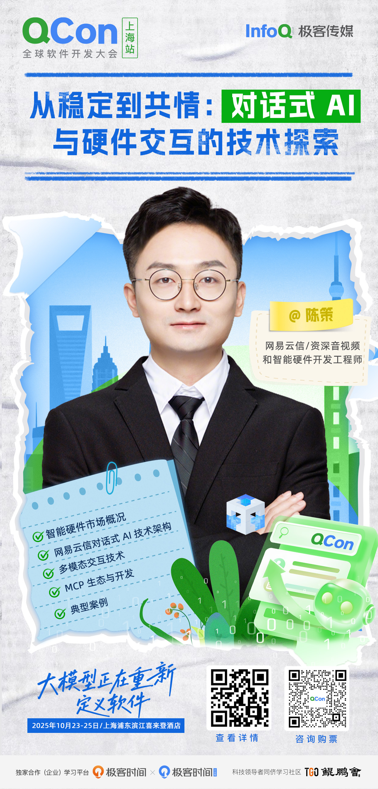10 月 23 日-10 月 25 日,QCon全球软件开发大会将在上海举办。本次大会将聚焦 Agentic AI、具身智能、强化学习框架、端侧大模型实践、多智能体协作等热门话题,以及 AI 时代下的软件研发、可观测、开源等技术实践,邀请来自腾讯、阿里、字节跳动、华为、蚂蚁集团、小红书等企业的技术专家,和来自清华大学、北京邮电大学、浙江大学的顶尖高校讲师,和你一起重构技术认知与能力边界!