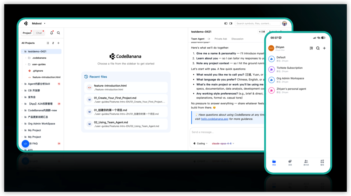 在 CodeBanana 里,最基本的单元不是文档,不是会议,也不是单条任务,而是“项目”。每个项目同时包含三层结构:群聊、Agent 和独立 Workspace。群聊承载人际沟通,Agent 负责调度执行,Workspace 沉淀上下文与资产。