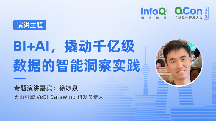 9 月 3 日 - 5 日,在 QCon 全球软件开发大会(北京站)上,火山引擎 VeDI DataWind 研发负责人徐冰泉将发表题为《BI+AI,撬动千亿级数据的智能洞察实践》主题分享,介绍字节跳动数据团队在 BI 平台建设上如何融合 AI 能力,保障 5 万多业务用户进行自助分析的实践经验总结。