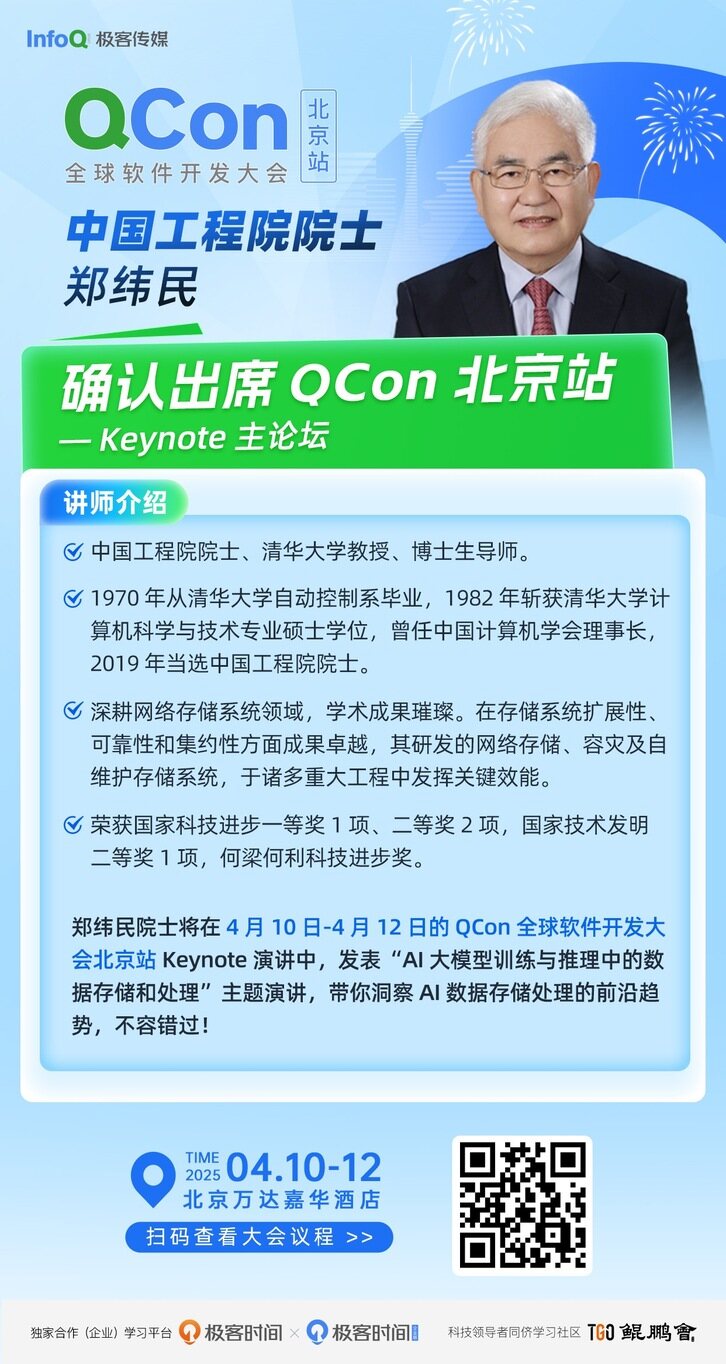 近日,中国工程院院士/清华大学教授/博士生导师郑纬民确认出席 QCon 北京大会并将发表主题演讲《AI 大模型训练与推理中的数据存储和处理》。