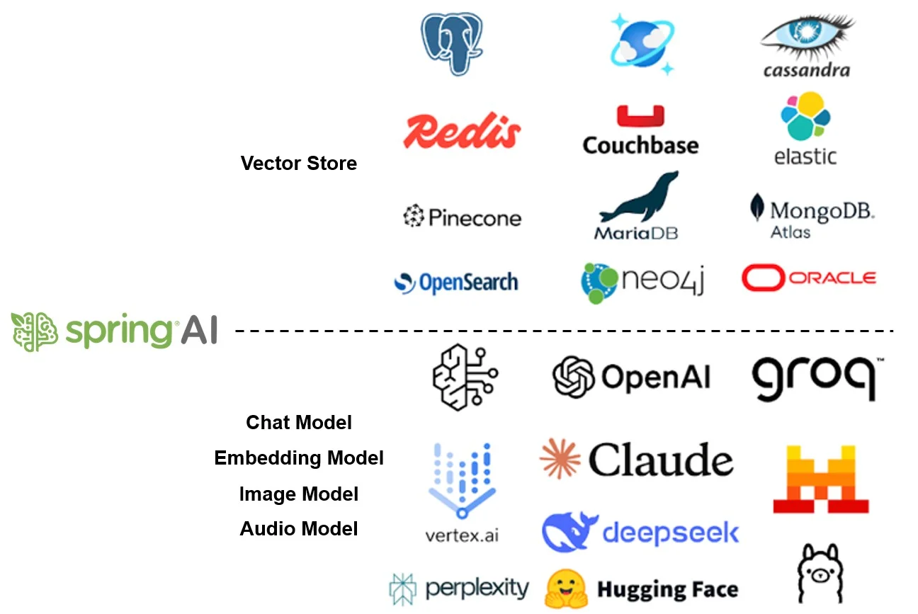 Spring 的既定模式被应用于 AI 世界。例如,控制反转(IoC)原则成为与多个 AI 提供商合作的基础。在一个项目中,你可以开始使用 OpenAI 进行原型设计,迁移到 Azure OpenAI 以满足合规要求,然后评估像 Hugging Face 这样的本地解决方案,这是一个提供 AI 和自然语言处理工具和预训练模型的开源平台,用于特别敏感的数据。有了 Spring AI,这些变化变成了配置更改,而不是新的实现。嵌入式模型、聊天模型、图像模型和向量存储因此不仅仅是技术抽象,而是允许你以业务逻辑而非集成的方式与 AI 合作的合同,从而腾出时间来创造价值。