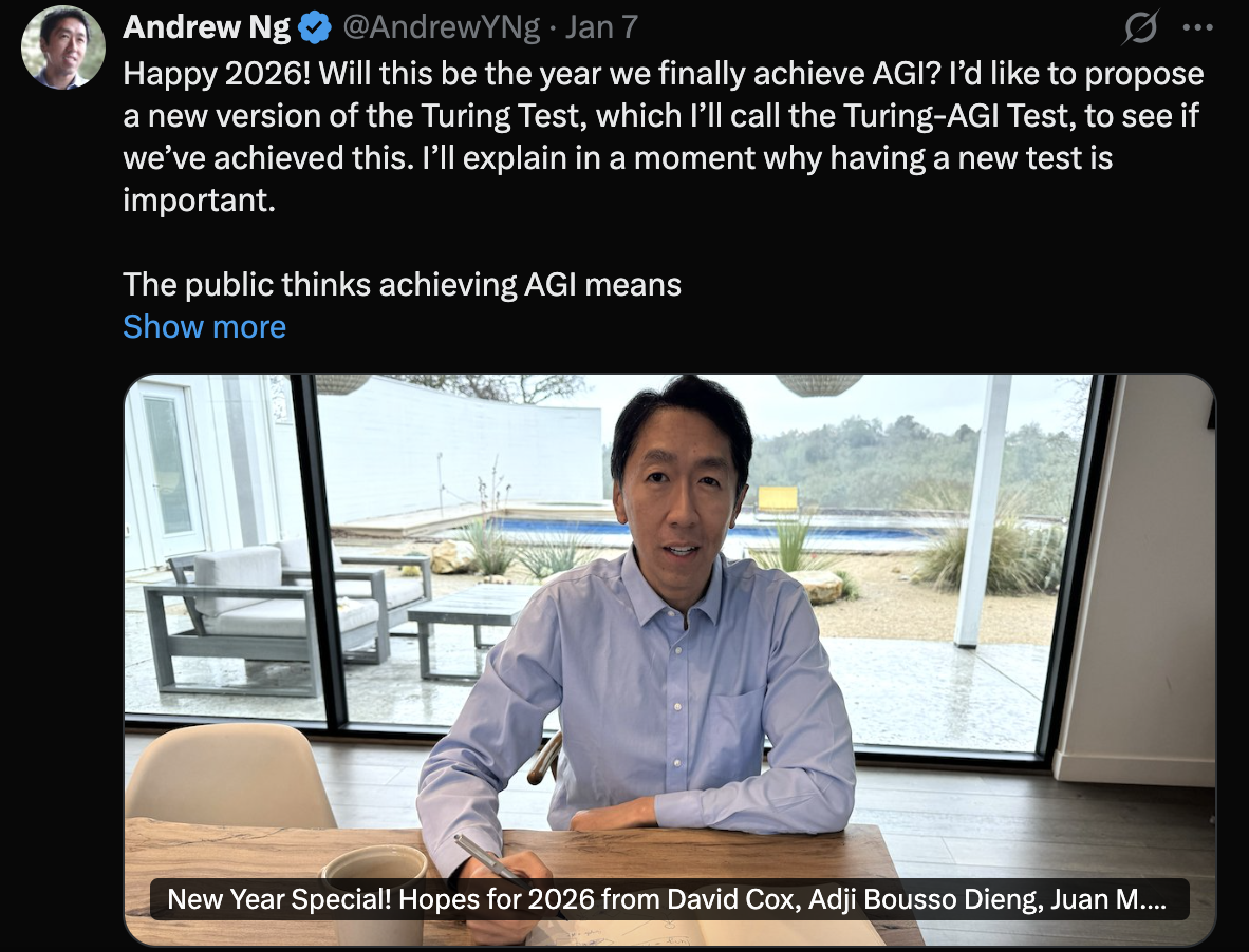 上个月,吴恩达团队针对当前 AGI 概念被过度炒作、定义模糊且标准混乱的问题,提出了一套以实际工作能力为核心的新版图灵测试,旨在重新界定 AGI、校准行业与公众预期,避免因虚高期待引发 AI 泡沫与行业寒冬。