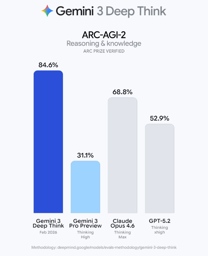 在 ARC-AGI-2 测试中,Deep Think 取得 84.6% 的成绩,并已通过 ARC Prize Foundation 的官方验证。