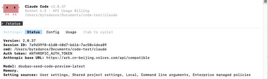 在 Claude Code 中输入/status 确认模型状态:接下来就可以正常使用 Claude Code 进行开发了!