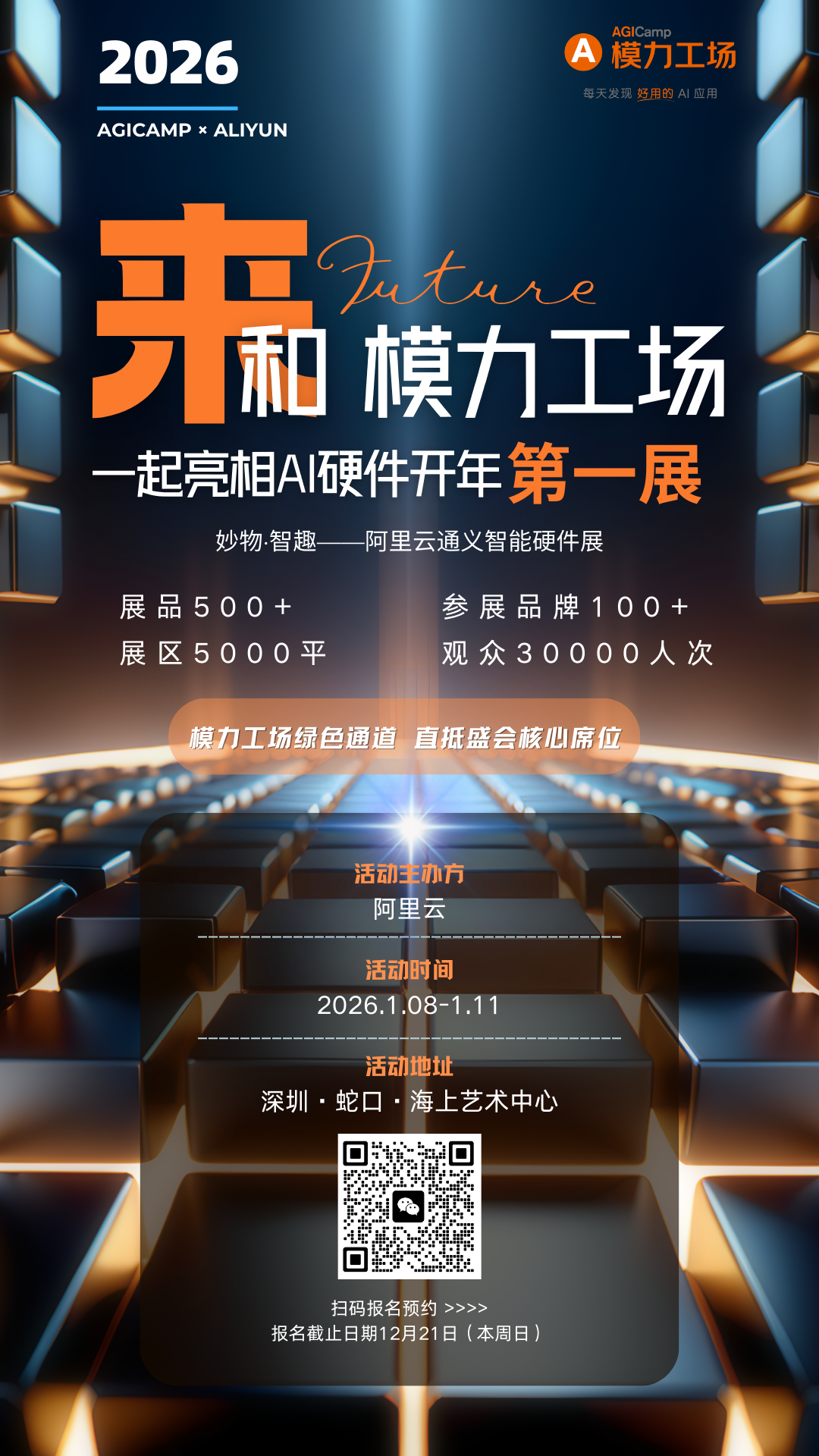 模力工场(AGICamp)将以参展合作伙伴参与本次大展,与来自产业、技术与应用一线的参与者一同,融入这场关于 AI 与智能硬件的开年交流。所有在模力工场平台上发布的 AI 应用,均有机会和模力工场一起参展本次智能硬件大会。