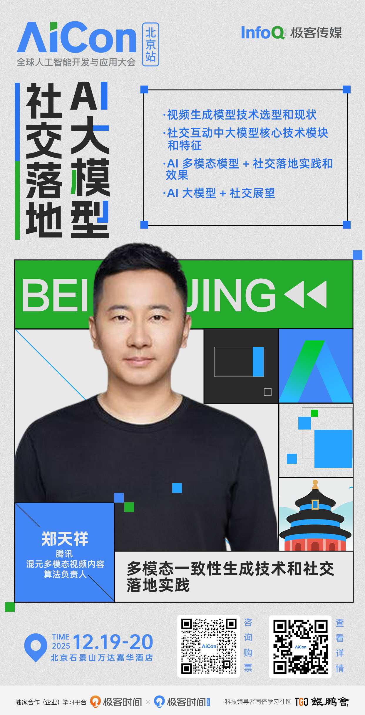 腾讯混元多模态视频内容算法负责人郑天祥已确认出席并将在「多模态从技术突破到创新应用落地」专题发表题为《多模态一致性生成技术和社交落地实践》的主题分享。SORA2 和 Veo3.1 等新一代视频生成模型,在持续拉高生成效果上限的同时,基于 SORA APP 等 AI + 社交产品,为行业提供了新的想象空间和落地经验。社交作为腾讯核心业务之一,如何在大模型时代找到 AI 和社交的新交汇点,让大模型技术赋能人之间的互动,是一个崭新又重要的命题。