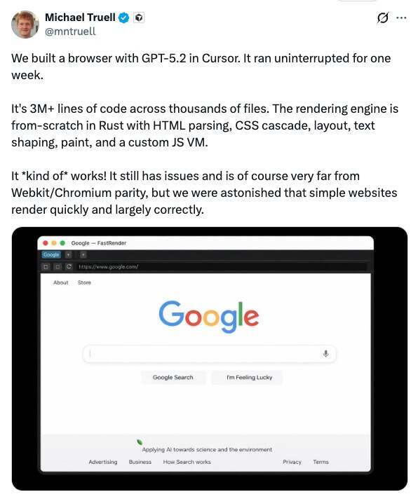 Cursor CEO Michael Truell 最近分享了一项颇为吸睛的实验:他们用 GPT-5.2 让系统连续不间断运行一周,从零构建出一个“可用”的 Web 浏览器。按他的描述,产出规模达到:超过 300 万行代码、横跨数千个文件,全部通过这套 AI 驱动的编程平台生成。
