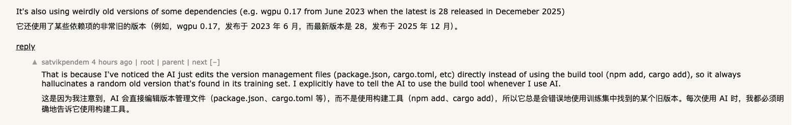 更搞笑的是,Cursor 这里用的还是一个发布于 2023 年 6 月的 wgpu 0.17 这种非常旧的老版本,而当前最新版本已经是 28(发布于 2025 年 12 月)。大概因为大模型写代码时往往会直接改版本管理文件(如 package.json、Cargo.toml),而不是通过 npm add、cargo add 这类构建工具来引入依赖。