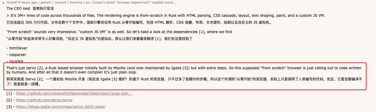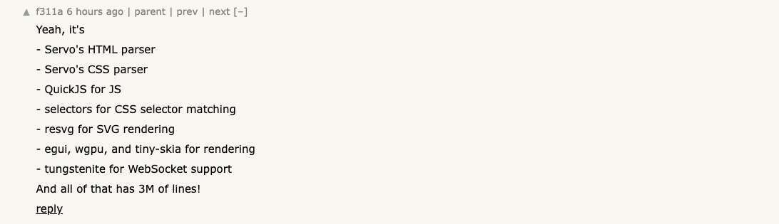 更多网友通过翻看仓库依赖发现,这个项目直接引入了 Servo (一个最初由 Mozilla 开发的基于 Rust 的浏览器)项目的 HTML 与 CSS 解析器(html parser、css parser),以及 QuickJS 的 Rust 绑定(rquickjs),并非所有关键组件都是自行实现。