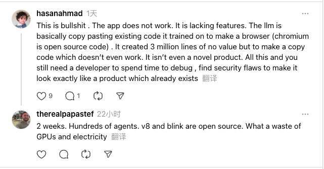 “这简直是胡扯。应用根本跑不起来,功能也缺得厉害。LLM 更像是在把它训练过的现成代码拼起来做个浏览器——毕竟 Chromium 本来就是开源的。最后堆出了 300 万行‘看起来很多’但没有价值的代码,结果还不能用,更谈不上什么新产品。折腾到最后,你还是得让开发者花大量时间去调试、排查安全漏洞,才能把它打磨得像一个早就存在的成熟产品。”