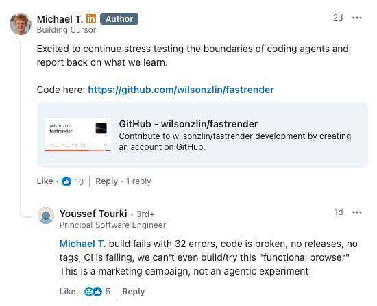 有人在 Michael Truell 的 LinkedIn 上直接把结果抛了回去:“构建直接失败,报了 32 个错误,代码本身就是坏的;没有任何 release、没有 tag,CI 也在持续失败,我们甚至连这个所谓‘可用的浏览器’都没法编译、没法试跑。这更像是一场营销活动,而不是一次真正的 agentic 实验。”Michael Truell 至今没有回复。