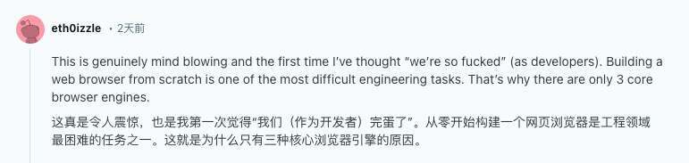 目前唯一一个在社交平台上明确分享“复现成功”的人,是前浏览器开发者 Oliver Medhurst。他表示自己花了大约两个小时修复编译错误和漏洞,才把项目跑起来。至于性能,他的评价也很直接:有些页面加载要整整一分钟,“不算好”。