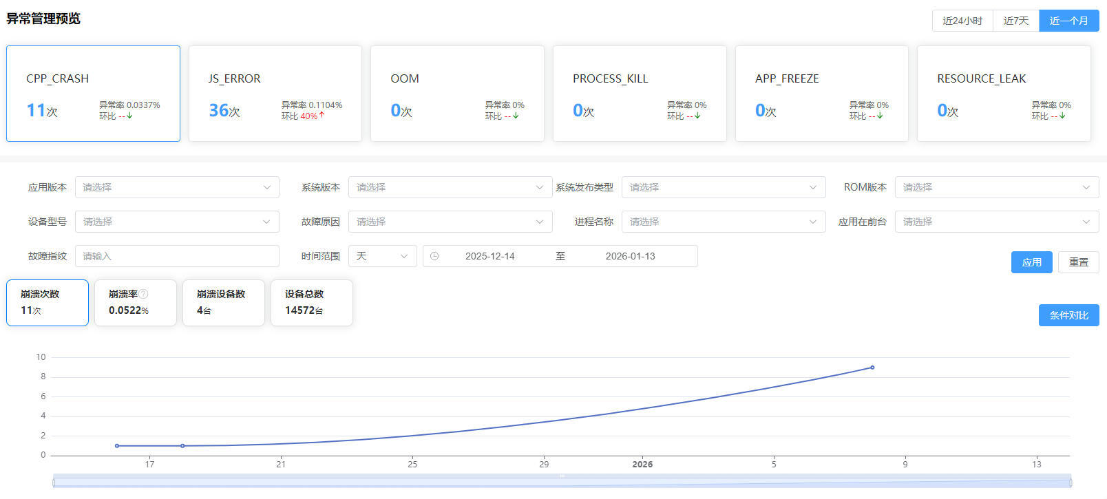 查看核心数据:默认展示异常指标(崩溃、无响应发生率)与性能全景图,支持自定义时间范围、设备型号、应用版本等筛选条件,数据实时更新,问题直观可见。