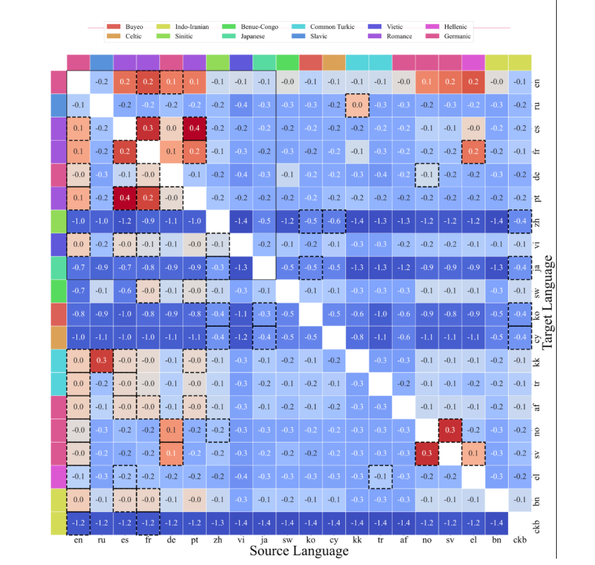 ATLAS 的核心是一种跨语言迁移矩阵,用于衡量在一种语言上训练对另一种语言性能的影响。分析结果表明,正向迁移与共享书写系统和语言家族高度相关。例如,斯堪的纳维亚语言之间表现出明显的相互增益,而马来语和印尼语则构成了一个高迁移效率的语言对。英语、法语和西班牙语则表现为广泛有益的源语言,这很可能与其数据规模和多样性有关,但这种迁移效应并不具备对称性。