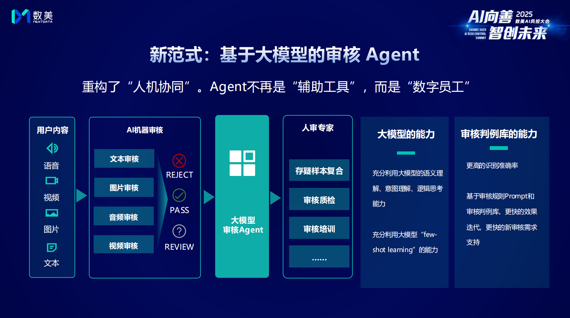 面对规模更大、语义更复杂、对抗更激烈的挑战,传统的“机审+人审”旧范式已难以为继。为此,以“大模型审核 Agent ”为核心驱动的“ AI 风控新范式”成为了新的趋势。梁堃表示,传统风控往往停留在识别违规关键词或图片的表层,而新范式则强调对“意图”与“潜台词”的深度理解。面对 AI 的错误、AI 的侵权及对 AI 的“攻击”等新型挑战,数美重构了“人机协同”模式——引入基于大模型的审核 Agent。
