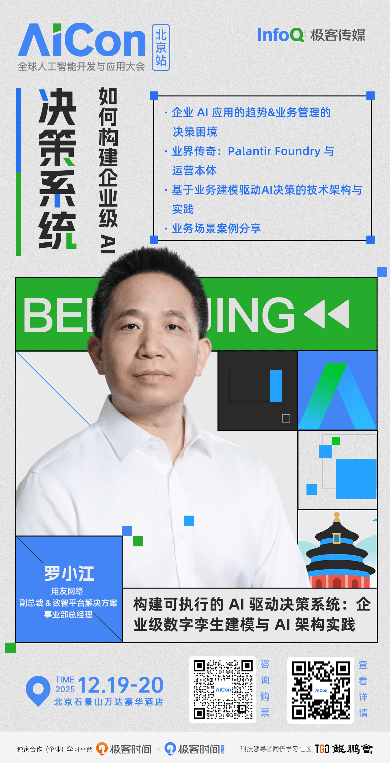 用友网络副总裁 & 数智平台解决方案事业部总经理罗小江已确认出席并将在「大模型与企业核心系统融合之道」专题发表题为《构建可执行的 AI 驱动决策系统:企业级数字孪生建模与 AI 架构实践》的主题分享。当 AI 从效率工具升级为决策引擎,企业却仍困于 “数据孤岛” 与 “经验决策” 的双重枷锁。本次演讲将直击企业决策痛点,先剖析传统 BI 架构的局限,再深入拆解以 “业务数字孪生” 为核心的智能决策新架构 —— 从多源数据融合治理,到业务对象关系建模,再到 AI 模型资产化管理。我们会通过 “洞察 - 预测 - 行动” 三步走的实践方案,结合真实案例,具体讲解如何用 AI 辅助决策,实现商业价值。