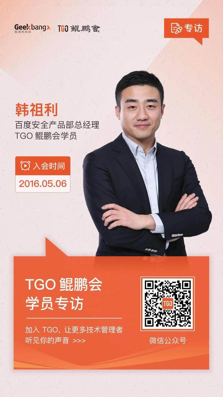 本文为 TGO 鲲鹏会学员专访,立足互联网时代演进趋势,分享技术管理者的思与得。受访嘉宾:韩祖利,百度安全产品总经理、前虎嗅联合创始人兼 CTO、TGO 鲲鹏会(北京)董事会成员