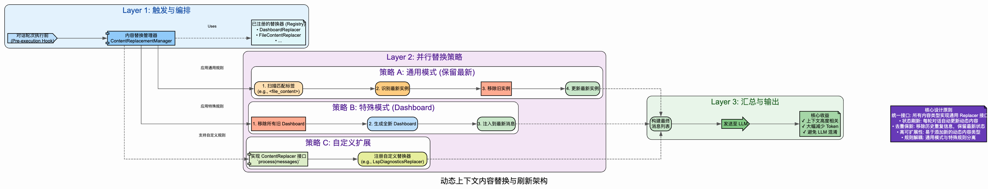 压缩 + 替换 + 保留:压缩处理历史信息,替换更新过时内容,dashboard 保留实时状态,三者配合确保上下文始终保持"精炼、准确、完整"