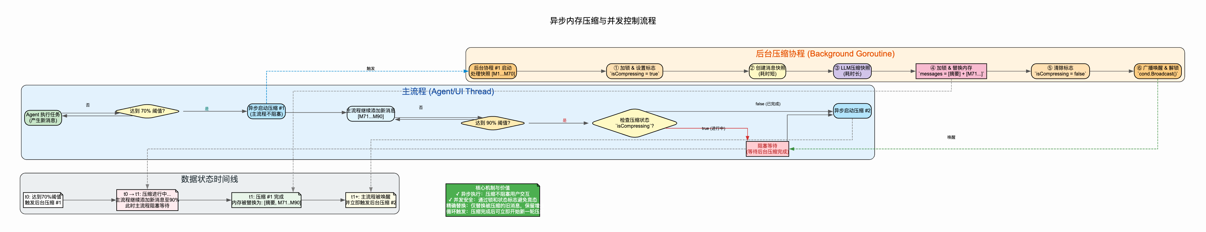 异步压缩机制:当检测到 token 接近限制时,启动异步压缩 goroutine,主流程使用条件变量等待压缩完成,避免阻塞用户交互