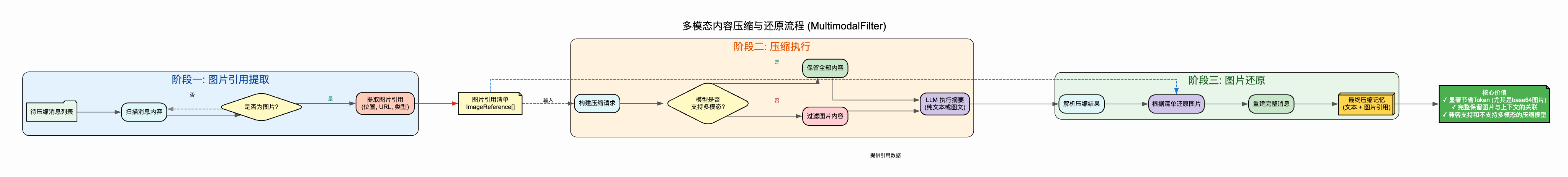 多模态内容过滤:压缩前提取图片引用信息,非多模态模型自动过滤 ContentItems 中的 image_url,压缩完成后还原图片到正确位置
