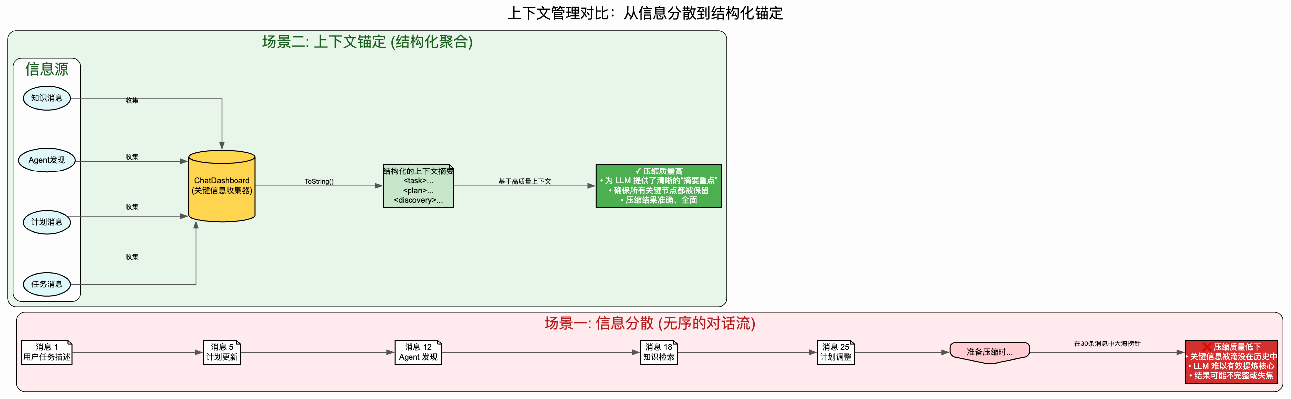 关键节点丢失:用户的初始任务、计划更新、Agent 的重要发现等关键节点信息,散落在大量的对话历史中