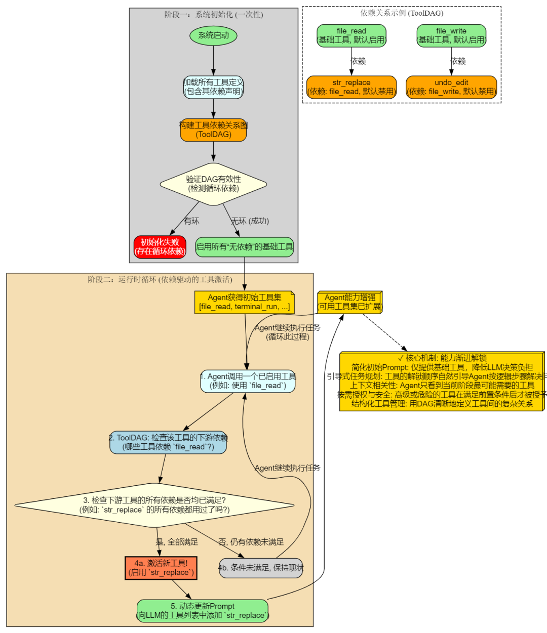 动态启用:当 Agent 使用了某个工具后,系统自动检查并启用依赖于这个工具的其他工具