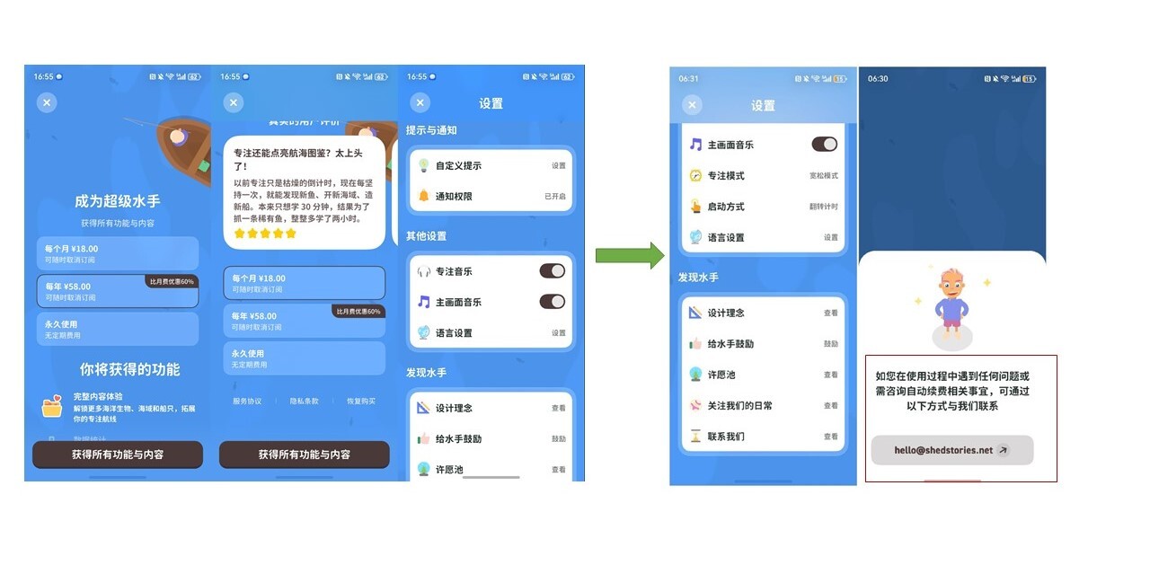 优化过程:应用含有付费订阅功能,但未提供官方客服联系方式。根据意见修改后,添加官方客服联系方式。