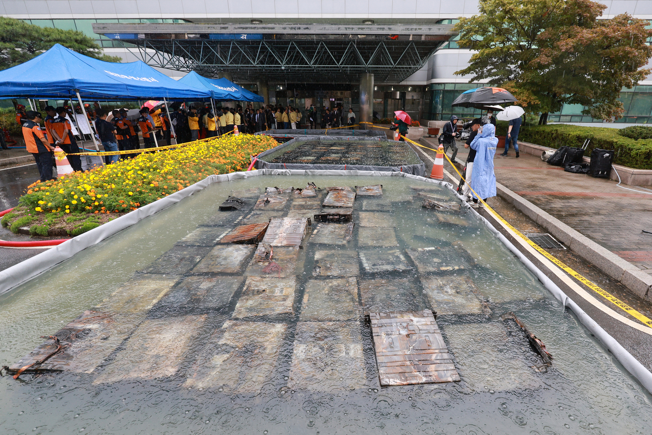 锂电池被浸泡在水箱中(图片来源:韩联社)