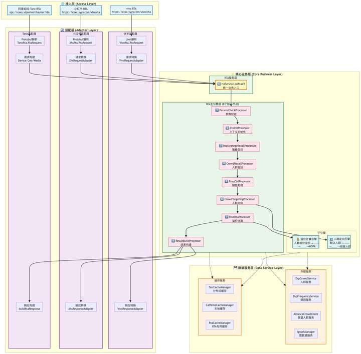 系统整体分为 网关层(承担高并发请求接入与流量路由)和业务逻辑层(在毫秒级窗口内完成设备解析、人群定向、策略召回、频控与出价计算等多阶段实时决策),最终返回竞价结果。