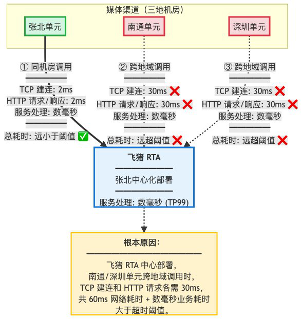 在接入多个外部媒体 RTA 后,跨地域调用问题凸显。由于媒体机房分布广泛(覆盖华北、华东、华南等区域),而飞猪 RTA 服务当时仅中心化部署于单一机房,导致跨地域单元调用时出现严重超时: