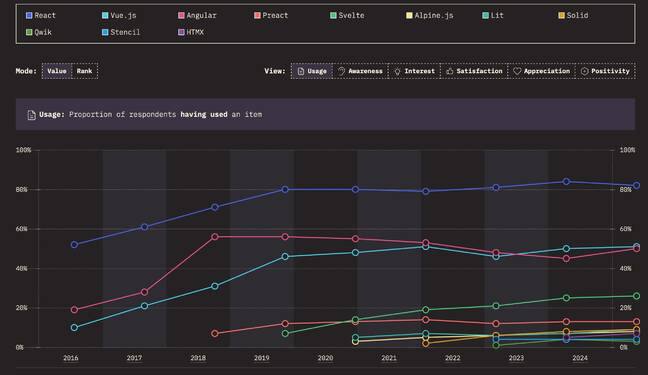 由 Facebook 在 2013 年创建的 React 是最流行的 JavaScript 框架。(Facebook 在 2021 年更名为 Meta。)最新的JavaScript使用情况调查报告显示,超过 80%的受访者使用了 React。React Native 是基于 React 的跨平台 UI 框架,虽然它不像 Web React 那样占主导地位,但微软是一个特别大的用户。React 的使用量也可能因为 AI 编码工具部署的增加而增加,根据我们的经验,如果没有提示使用不同的框架,这些工具往往默认使用 React。