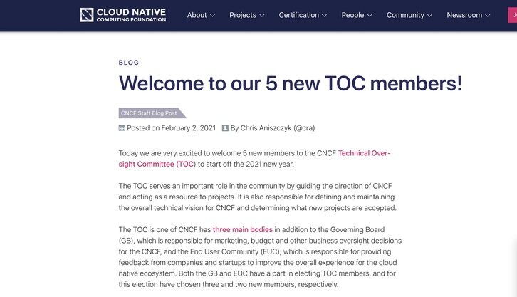 2021 年 2 月 3 日,全球顶级开源社区云原生计算基金会(Cloud Native Computing Foundation,简称 CNCF)正式宣布其新一届技术监督委员会(Technical Oversight Committee,简称 TOC)席位改选结果。来自阿里云的张磊入选,成为全球 9 名代表之一,为社区提供技术指导。加上上一届成员来自阿里云李响,CNCF 已经连续两届有中国面孔入选。