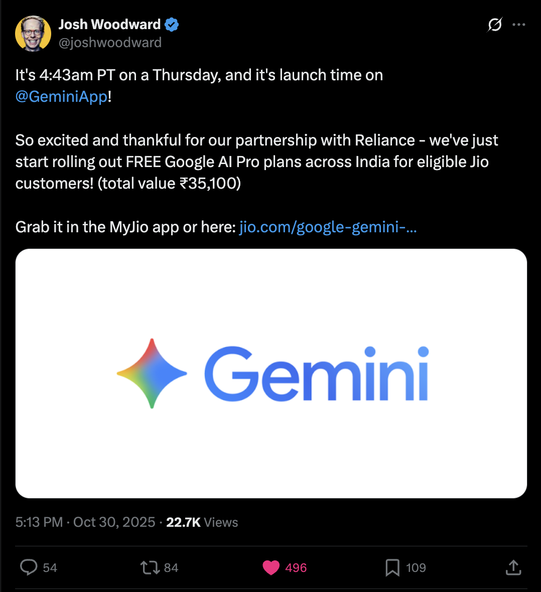 然后是印度移动网络运营商 Jio 与谷歌合作,向 18 至 25 岁的用户免费提供 18 个月的 Gemini Pro 服务——账面价值约 35000 卢比(约合人民币 2810 元)。这发生在 11 月初。