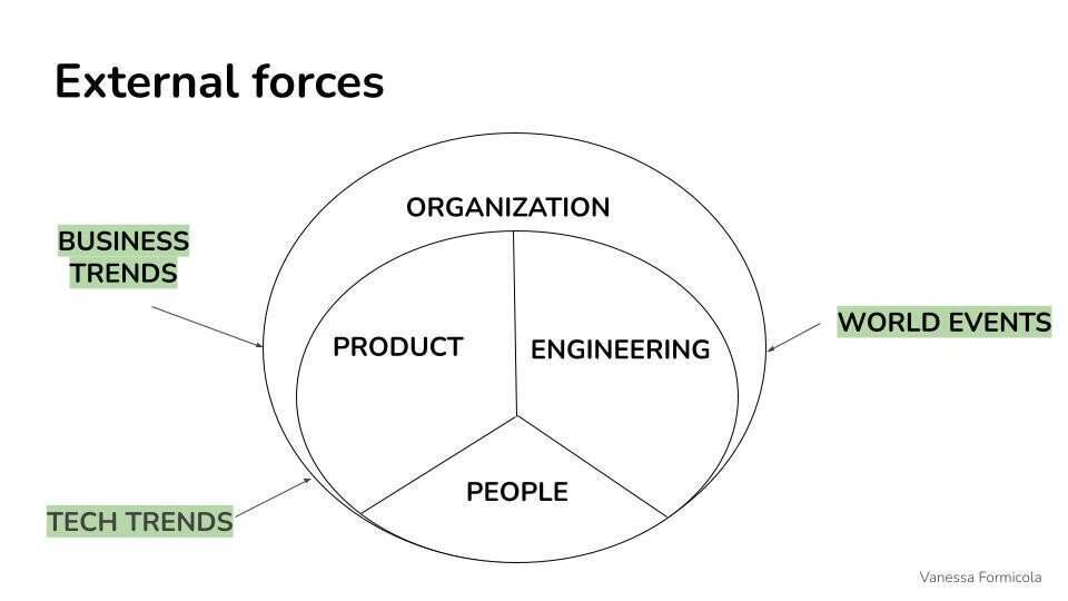 商业趋势也提出了类似的挑战。如果没有了解产品在更广泛的商业背景中的位置,团队很难确定哪些组件会发生变化,哪些会保持稳定。了解哪些因素可能完全颠覆市场或摧毁产品对于优先考虑技术决策至关重要。
