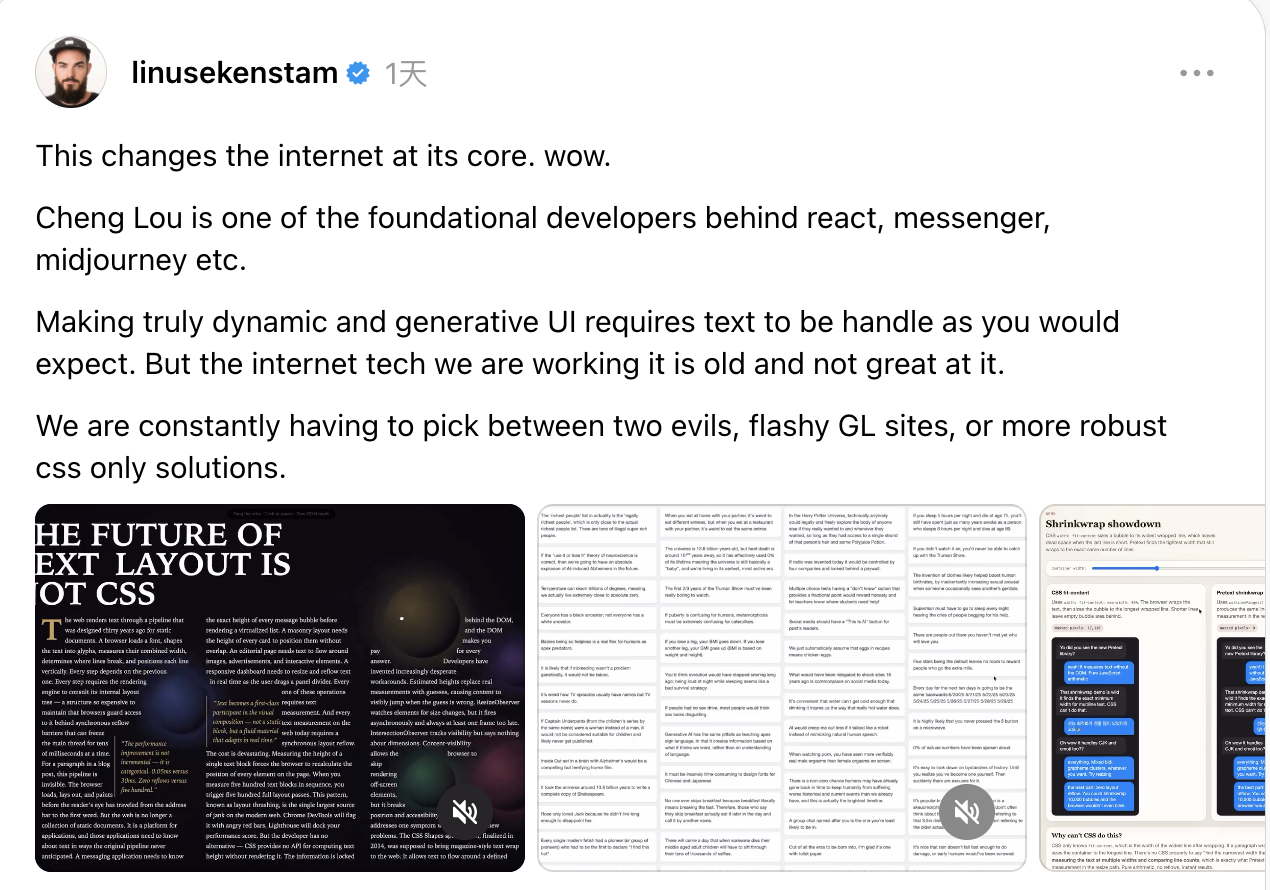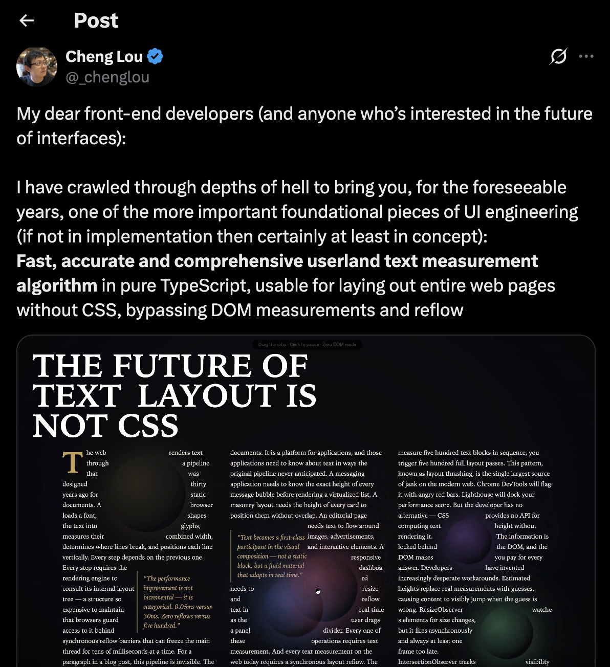 “Cheng Lou 是 React、Messenger、Midjourney 等项目的核心开发者之一。创建真正动态的生成式 UI,需要我们能按预期操控文本。但我们目前使用的互联网技术老旧且力不从心。我们总是不得不在两个糟糕的选择中做抉择:要么是花里胡哨的 GL 站点,要么是更稳健但死板的纯 CSS 方案。”