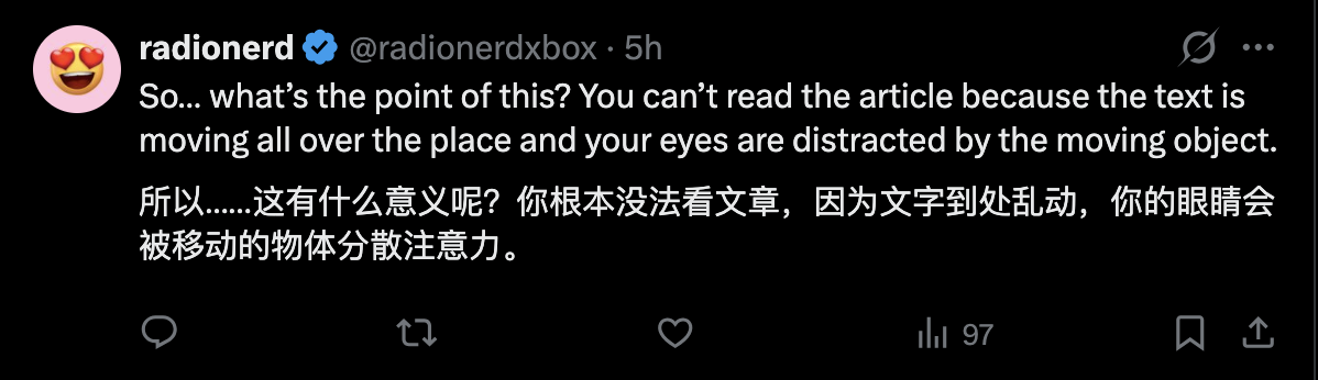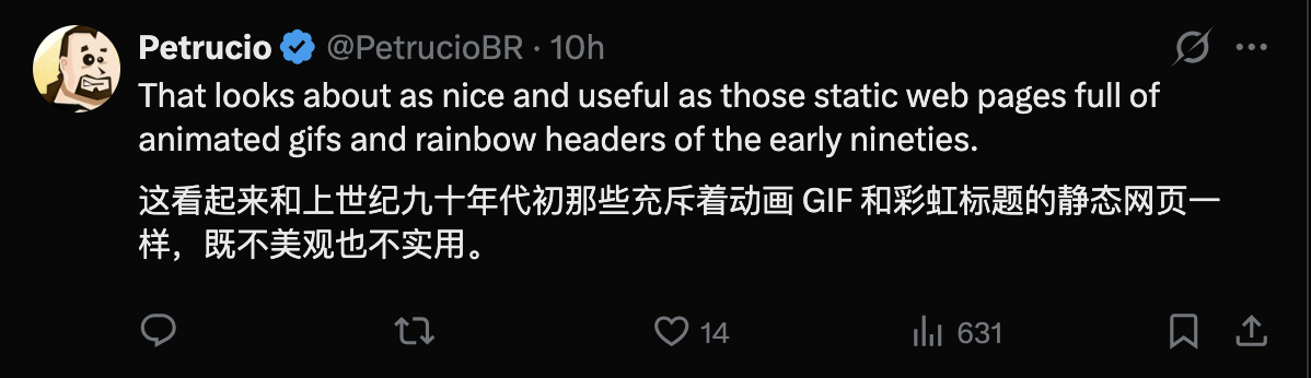 值得注意的是,这个项目并不是一边倒的好评。在 X 上,有用户表示,“这看起来和上世纪九十年代初那些充斥着动画 GIF 和彩虹标题的静态网页一样,既不美观也不实用。”