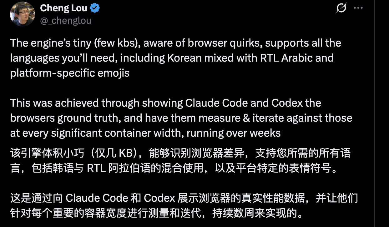 Cheng Lou 调侃道,虽然有点滑稽,但 Claude 这类编码工具的确辅助了 Pretext 的开发。
