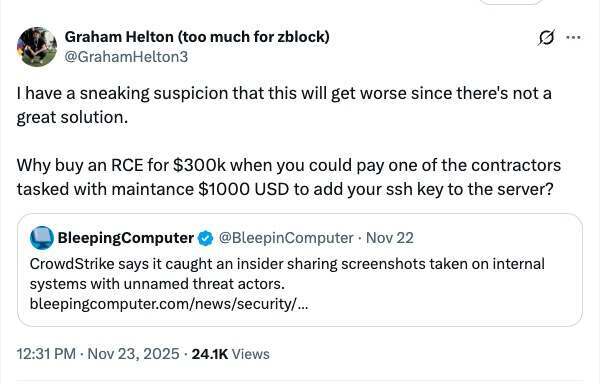 Snowflake 的高级红队工程师 Graham Helton 就在 X 上半开玩笑地说:与其花 30 万美元去买一个远程代码执行漏洞(RCE),不如花 1000 美元,用一种更“人性化”的方式,直接收买一个有维护权限的外包人员,让他把你的 SSH 公钥塞进服务器里。