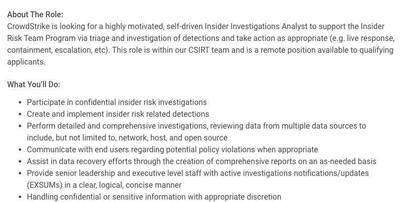 从 CrowdStrike 的岗位描述来看,“内鬼分析师”既要看得懂网络、终端、云环境里的各种日志和安全告警,也要有基本的调查和证据意识,知道怎么还原事实、写清楚报告,还要敢于并及时和当事员工沟通潜在违规行为。