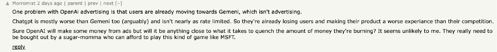 在 Hacker News 上,有用户表示,由于他们加了广告,很多用户已经转向了 Gemini,所以长远来看这种行为是得不偿失。